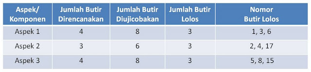 Tabel di bawah ini adalah contoh Tabel sebaran butir. Di dalamnya ada butir yang direncanakan untuk dipakai dalam skala jadi dan butir yang dipakai dalam skala uji coba. Nomor-nomor butir juga disertakan untuk mengetahui sebaran butir di dalam skala berdasarkan komponennya.